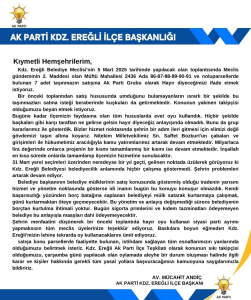 AK Parti Kdz. Ereğli İlçe Başkanı Av. Mücahit Andiç, Kdz. Ereğli Belediye Meclisi’nin 5 Mart 2025 tarihli toplantısında gündeme gelecek şehir içi toplu taşıma ücret tarifeleri ve Müftü Mahallesi’ndeki bazı taşınmazların satışının görüşülmesi konularına ilişkin bir basın açıklaması yaptı.