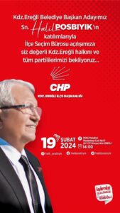 “Karadeniz Ereğli Belediye Başkan Adayımız Sayın Halil Posbıyık’ın katılımlarıyla İlçe Seçim Bürosu açılışımıza siz değerli Karadeniz Ereğli halkını ve tüm partilerimizi bekliyoruz. Davetlisiniz.