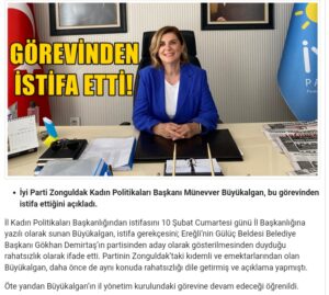 İYİ Parti Zonguldak İl yöneticisi, Kadın Politikaları Başkanı Münevver Büyükalgan’ın, İYİ Parti Genel Başkanı Meral Akşener ve genel merkez yöneticilerinin Gülüç Belediye Başkanı Gökhan Mustafa Demirtaş’ın adaylığına resmi onay vermesinin ardından sadece Kadın Politikaları Başkanlığı’ndan istifa edip il yöneticiliği görevine devam etmesi siyasi canbazlık olarak değerlendirildi.