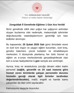 3. Zonguldak’ta Salı Günü Eğitime Ara Verildi